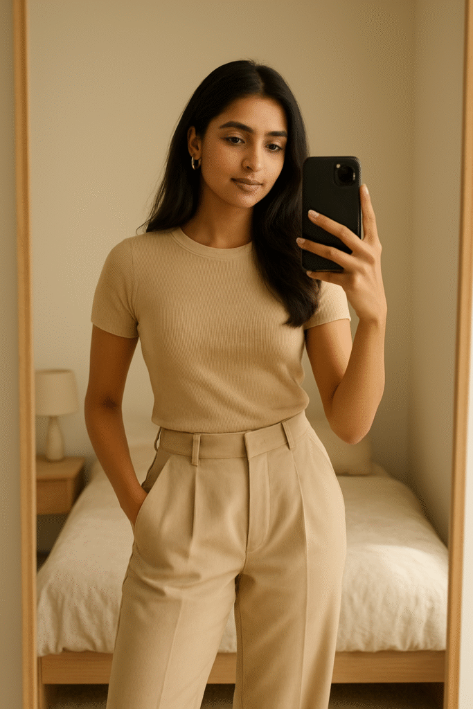 prompt:- “Modern Indian girl taking a mirror selfie in a minimal beige bedroom, soft sunlight, high-waisted trousers, pastel top, natural makeup, warm tones, ultra-clean 4K aesthetic.”