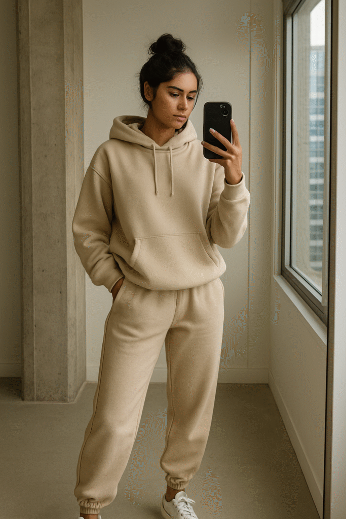 prompt:-“Indian girl in oversized hoodie and joggers taking a mirror selfie near a big window, sneakers, messy bun, cool urban mood, crisp 4K quality.”