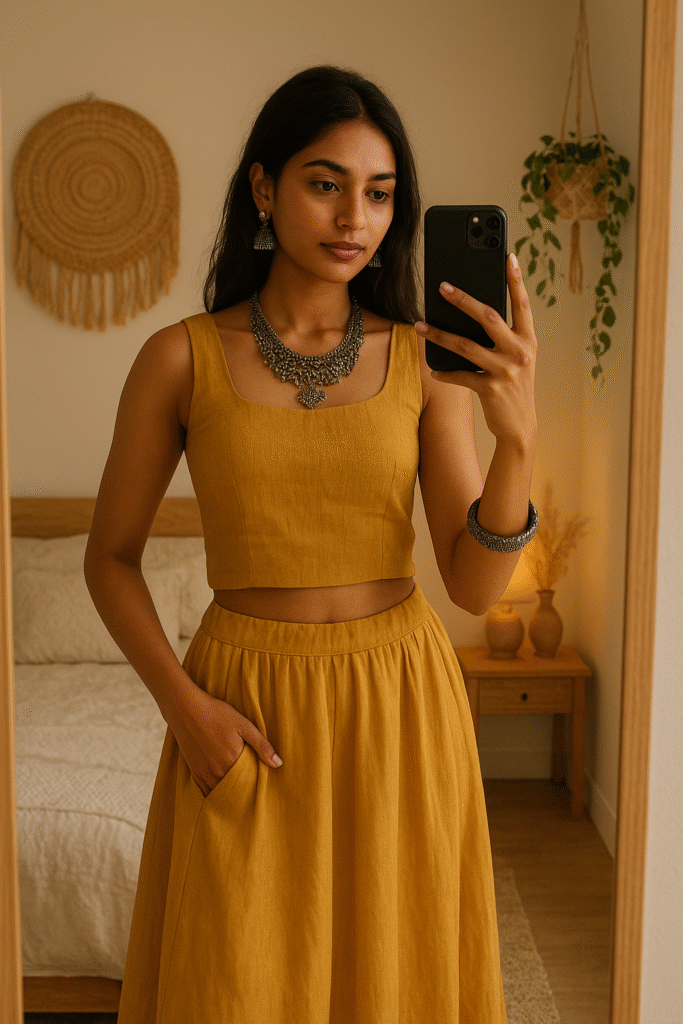 prompt:-“Indian girl in Indo-Western outfit taking a mirror selfie, oxidized jewelry, boho room décor, soft warm lighting, ultra-sharp 4K shot.”