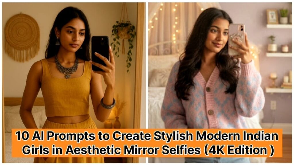 Mirror selfies have become the new aesthetic language — a blend of confidence, personality, and effortless style. Whether you’re exploring AI creativity for reels, blogs, or social content, these prompts will help you generate chic, elegant and modern Indian girl portraits in stunning 4K detail.