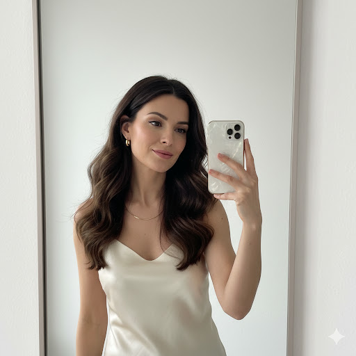 prompt:-“Girl with long wavy hair holding phone for mirror selfie, white wall background, minimal accessories, classy subtle expression, premium 4K clarity.”