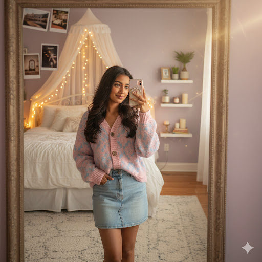 “Indian girl in pastel cardigan and light denim capturing mirror selfie in cozy bedroom, fairy lights, aesthetic room décor, dreamy 4K vibe.”